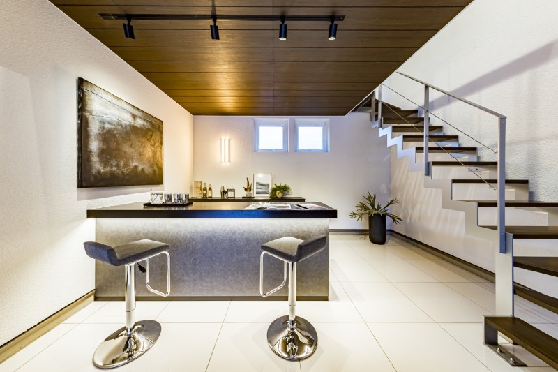 吹き抜けのあるリビング階段横のスペースを活かした、隠れ家的なバーカウンター。